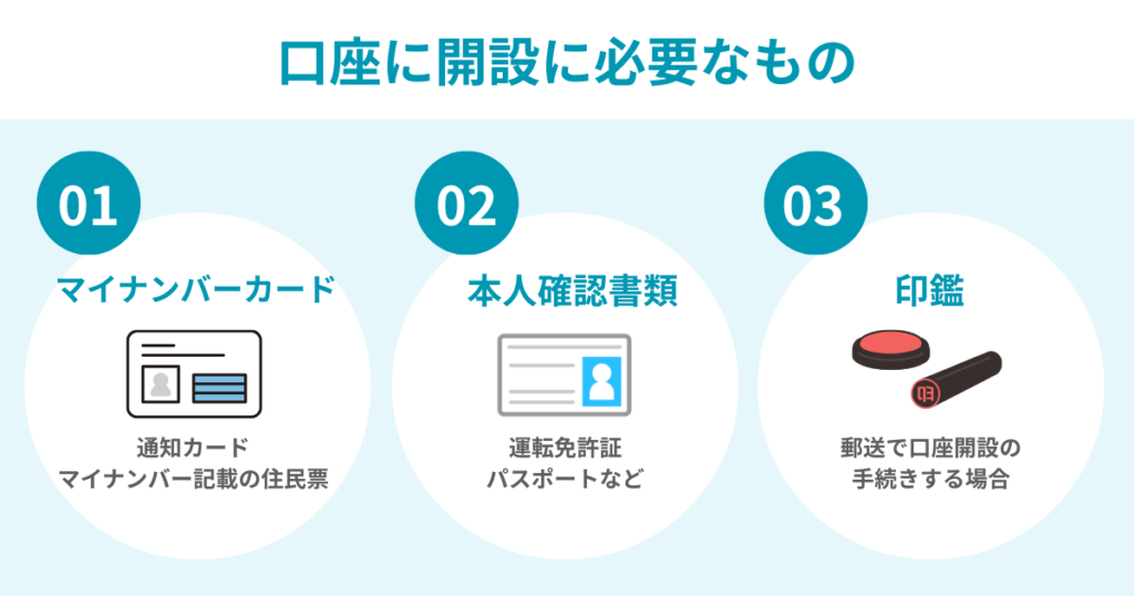 マイナンバーカードが手元にない場合は、通知カードやマイナンバー記載の住民票で代用可能です。運転免許証などの本人確認書類と合わせて、口座開設の手続きを進めましょう。