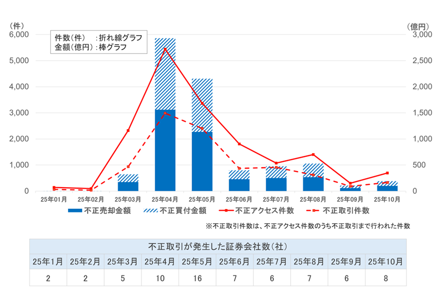金融庁が発表したインターネット取引サービスの不正アクセス件数は、2025年初頭から5月までに被害件数は累計5958件です。証券口座を狙った不正取引が急増し、被害総額は5000億円を超えます。