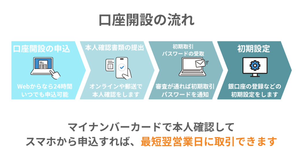 オンライン申込みより郵送手続きの方が、取引開始までの日数が伸びる傾向があるので注意しましょう。