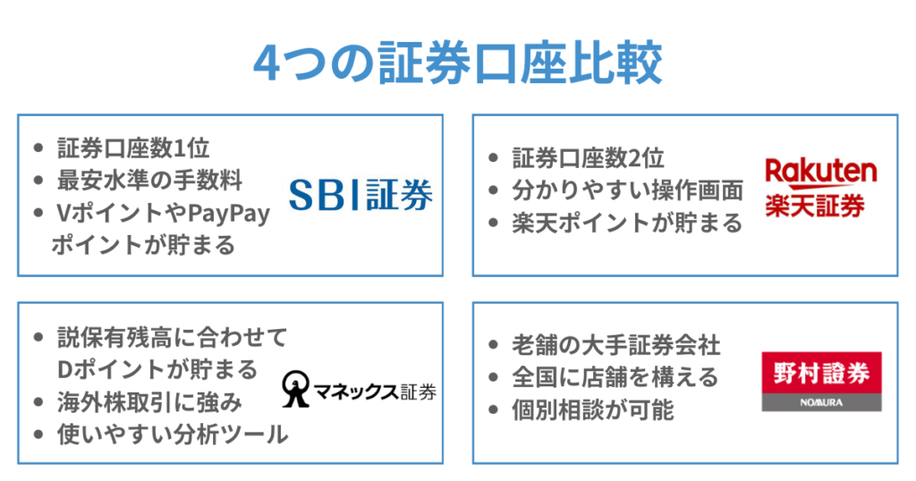 証券口座を開設する流れと必要なものが分かったけれど、どこで証券口座を開けばいいか迷いますよね。ここではおすすめの証券口座を4つ紹介します。