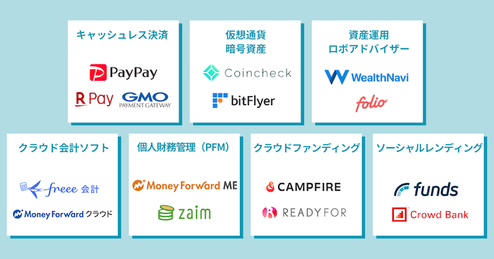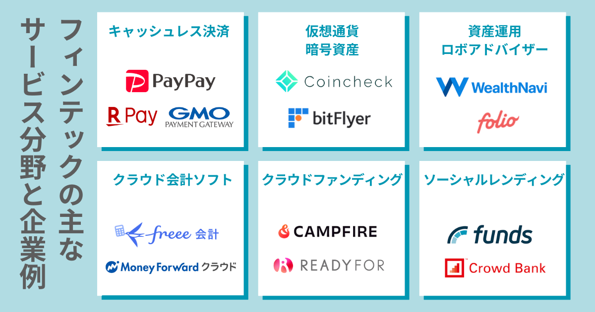 フィンテック企業の例では、CoincheckやbitFlyerが有名です。インターネット上でやりとりできる仮想通貨は、フィンテックサービスの一つです。