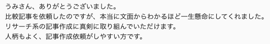 リサーチが丁寧で安心して記事を任せられると、お褒めのお言葉をいただたきました。AIで効率化を進めつつ、必ず公式なサイトから事実確認をいたします。