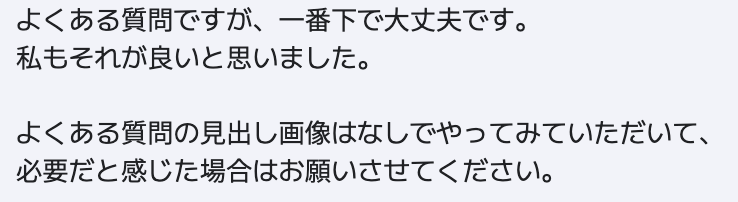 LLMO対策として、よくある質問(FAQ)を記事の最後にするのはどうかと提案しました。またFAQ下の画像は不要だと判断し、合わせて提案させていただきました。読者のためにどうしたら分かりやすくなるか?を常に考え、クライアント様にとって利益になることは積極的に提案しています。